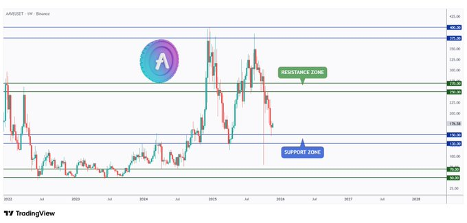 AAVE moves toward the $150 weekly support that has defined several long-term accumulation phases. According to AltCryptoTalk, this zone has repeatedly provided a stable platform for bullish recoveries. The market now tests this area again after a steady multi-week pullback.