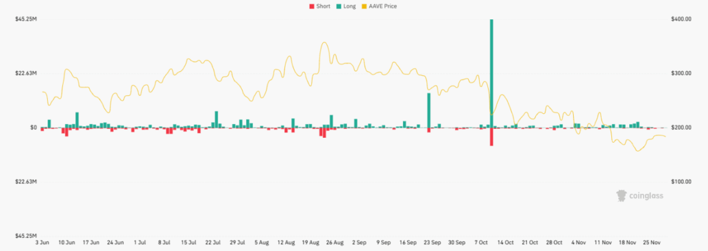 The Aave Total Liquidations Chart adds context, showing muted activity early in the period, followed by increased long liquidations as price weakened. A major liquidation event in early October signaled a broad deleveraging wave. Afterward, liquidation volume declined as traders reduced exposure while price drifted toward $150.