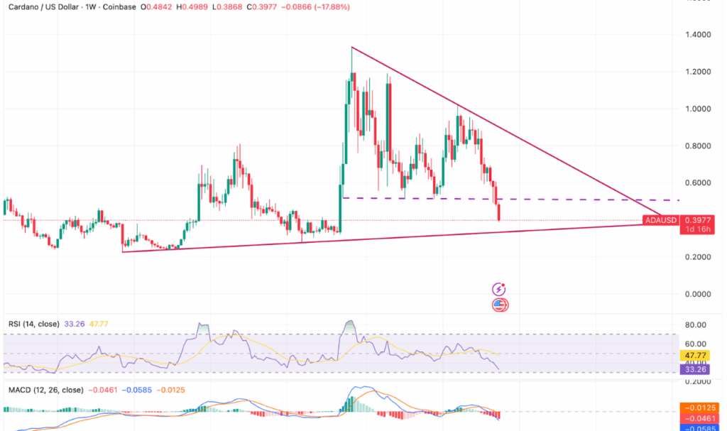 Cardano is trading near $0.398 after falling below a crucial horizontal support level that held firm around $0.52 for several months. This breakdown marks a significant structural change as the cryptocurrency tests a long-standing ascending trendline traced from the 2023 lows. The trendline has now become the final technical support holding the broader bullish structure.