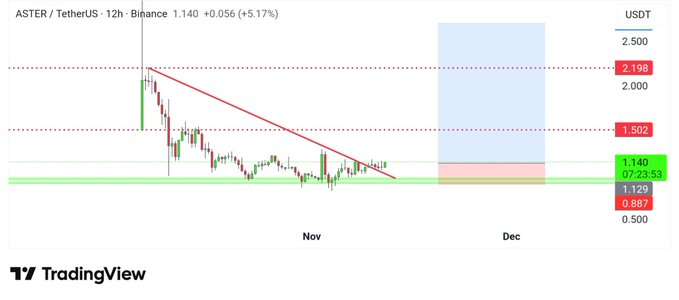 The ASTER/USDT 12-hour chart on Binance reveals a breakout from a descending resistance line that had capped price action since early November. Market analyst Crypto Candy (@cryptocandy24x) noted the pattern on social media, describing it as an early-stage breakout with potential for a 20–50% short-term move.