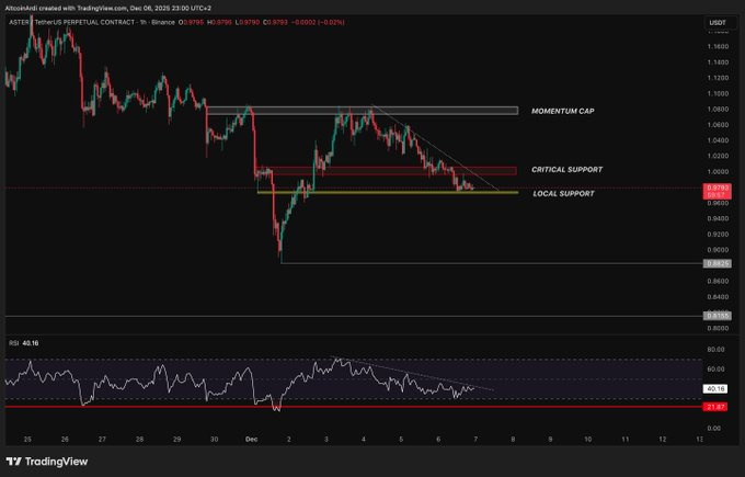 Aster is trading near a fragile technical area as the market continues to weaken. The recent pullback has created a tightened structure, with traders monitoring whether the current support zone can withstand growing pressure from persistent selling.
