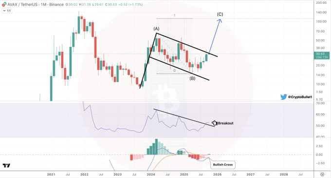 Analyst CryptoBullet (@CryptoBullet1) described AVAX as “absolutely ready” on the monthly chart, citing both a bullish RSI breakout and a MACD cross. The token is currently forming a large bull flag pattern, often regarded as a continuation structure in strong uptrends.