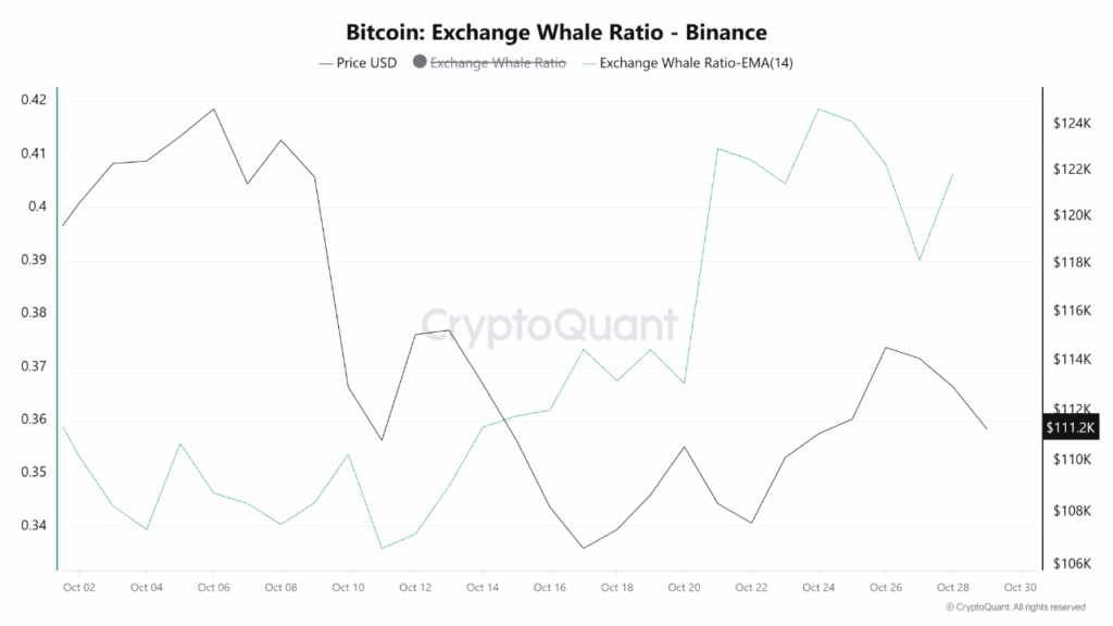 Bitcoin’s steady climb in October coincides with this rising ratio, creating a divergence between price action and whale activity. Analysts interpret this as a potential supply wall forming on Binance, where large holders could absorb bullish momentum through steady sell orders.