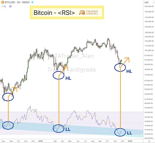 Bitcoin enters a constructive technical region on the 3-day timeframe as noted by Trader Tardigrade. The RSI goes back to its traditional support rebound area, an area that has supported previous cyclical turns. The indicator makes a lower low and price makes a higher low, with a hidden bullish divergence.