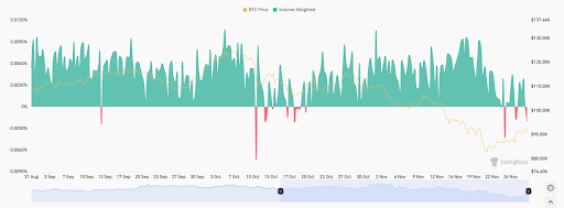 The volume-weighted funding chart from late August to late November captures a shift in derivatives positioning. Funding stayed positive for most of September and early October as Bitcoin traded between $100K and $130K. Long exposure dominated during this period, reflecting strong speculative confidence.