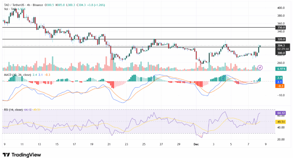 - Bittensor’s price surged by 7% in 24 hours, reaching over $300 as the cryptocurrency market rebounds.