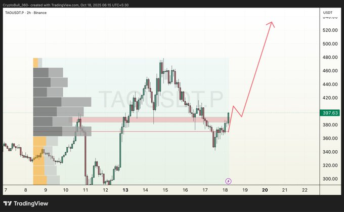 A post from analyst CryptoBull_360 (@CryptoBull_360) stated that “#TAO is getting ready for a massive breakout from PoC+Horizontal support zones as well, Volume rising as good momentum.” This observation aligns with the chart’s rising volume profile, where expanding participation supports a potential move toward the $420–$430 resistance range.