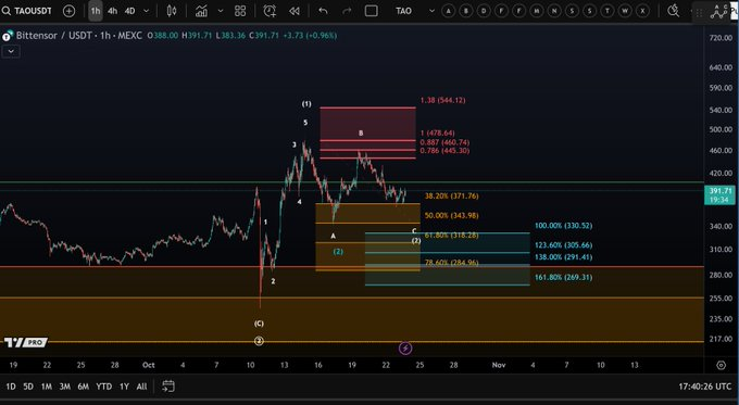 According to a recent market outlook shared by @Morecryptoonl on X (formerly Twitter), “$TAO still appears to be unfolding within wave C of (2) in the white scenario. There is currently no sign that the ongoing pullback is complete, with the next key area expected around $330.”