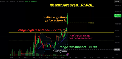 - Strong trading volume confirms active buying interest as BNB trades in price discovery beyond its multi-year range breakout.