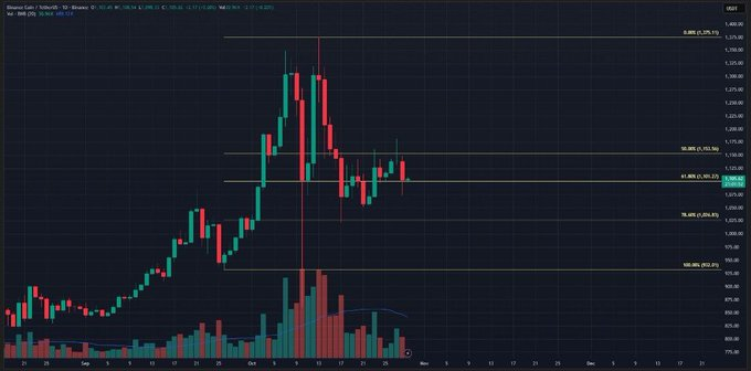 The graph has BNB fluctuating between the 0.5 Fibonacci level of approximately $1,105 and the 0.618 retracement of $1,020 in a temporary holding pattern after the rally between $550 and $1,300 earlier in the quarter. The volatility pullback indicates traders are catching their breath to retest direction after months of uninterrupted gains.