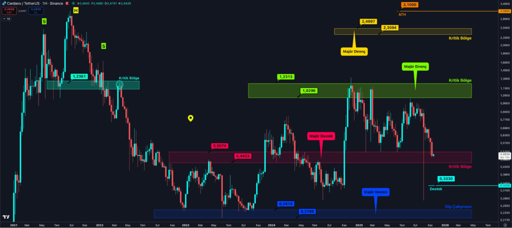 • Multi-year charts show ADA fluctuating inside major support and resistance bands, with current candles resting in a key 0.44–0.50 trading zone.