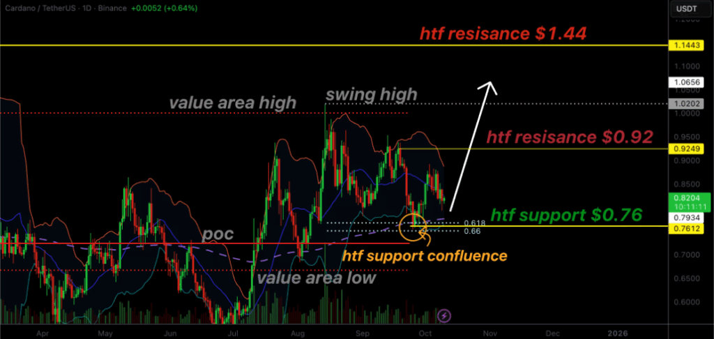 Cardano’s price has steadied near the $0.76 support level after a recent pullback, signaling renewed stability in the market. The $0.70 to $0.76 region continues to serve as a crucial support area, strengthened by the confluence of Fibonacci retracement levels, the Point of Control, and the lower Bollinger Band. This alignment has historically drawn buyers, reinforcing the foundation for potential upward movement.