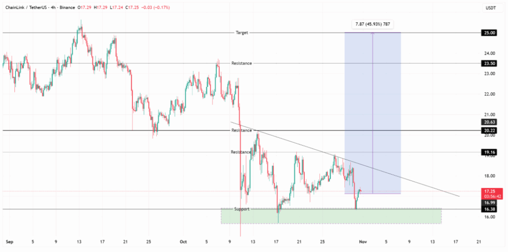 LINK has continued trading above the $16.90 range, a level that has repeatedly confirmed strong buyer demand. Chart analysis shows a double-bottom pattern near $16.38, which indicates that buyers have consistently defended this zone.