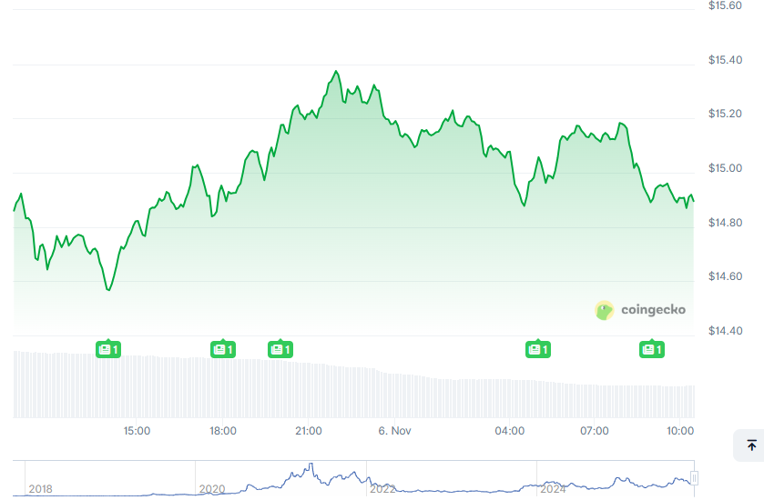 The token is at a corrective stage as it was rejected towards the $20 area in October. Price has been progressing down a declining trendline whereby lower highs are established, which is a continuous short-term bearish pattern. LINK is currently trading at approximately 14.88 and it has a volume of 790.8 million in 24 hours which is a slight increase of 0.25 percent and a negative growth of 18.12 percent in seven days.
