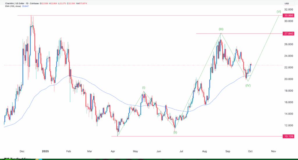 From a technical perspective, Chainlink’s price is currently in the fourth phase of the Elliot Wave pattern, a typically bearish stage. Despite this, the coin’s performance is supported by the 100-day Exponential Moving Average (EMA), and analysts are forecasting a potential bullish fifth wave. The next target for LINK’s price is the year-to-date high of $27.85, with a further surge possible if it surpasses this level. A move past $30 could open the door for more significant gains.
