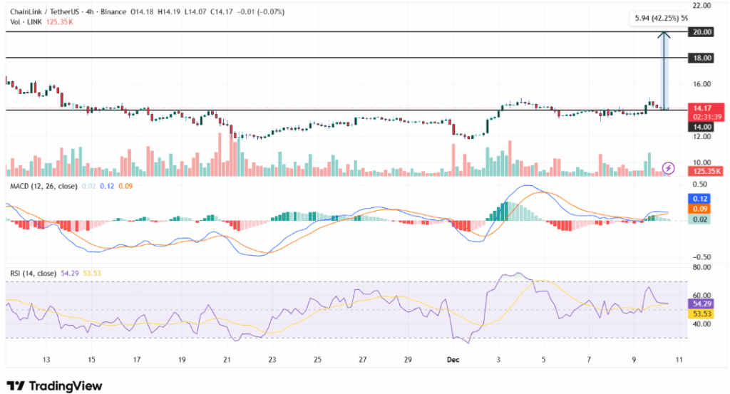 Chainlink’s (LINK) price has shown strong potential to surge toward the $20 mark in the coming weeks. Trading at $14.11 as of Wednesday, December 10, 2025, the cryptocurrency has demonstrated an encouraging upward trend. Recent price movements have been marked by higher lows, signaling strong foundations for future growth. With market indicators leaning toward bullish behavior, Chainlink is poised to reach new heights.
