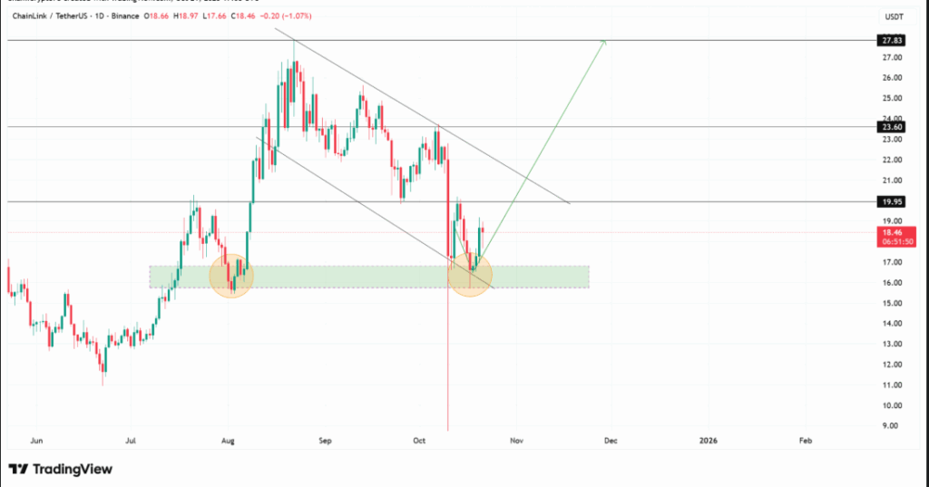 Chainlink’s price rebounded strongly from the $16 demand zone, a level that has repeatedly triggered major recoveries. This area has become a key support range as investors continue to view it as a value-buying opportunity. The price structure has remained within a descending channel, where the lower boundary consistently attracts buyers, showing a sustained level of market confidence.