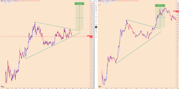 A comparable structure on a previous chart plays an important role in market expectations. That earlier formation broke upward with force once compression reached its final stage. The consistency between the two formations shapes the current discussion around Chainlink’s broader trajectory.