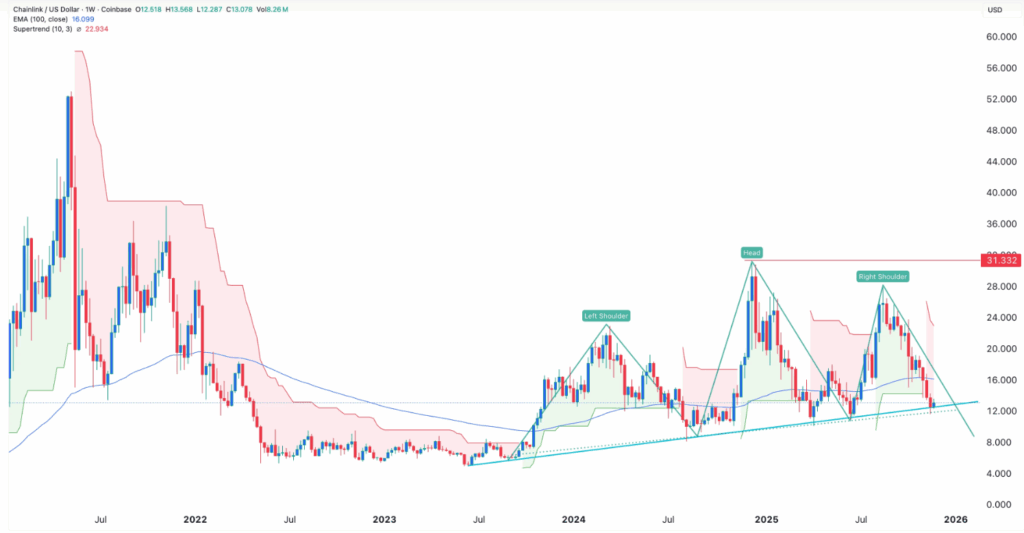 From a technical analysis perspective, Chainlink’s price chart reveals concerning signs for investors. The weekly chart shows that the token has formed a head-and-shoulders pattern, a classic bearish reversal signal. LINK has also dropped below the 100-week Exponential Moving Average (EMA) and the Supertrend indicator, both of which are crucial technical levels.