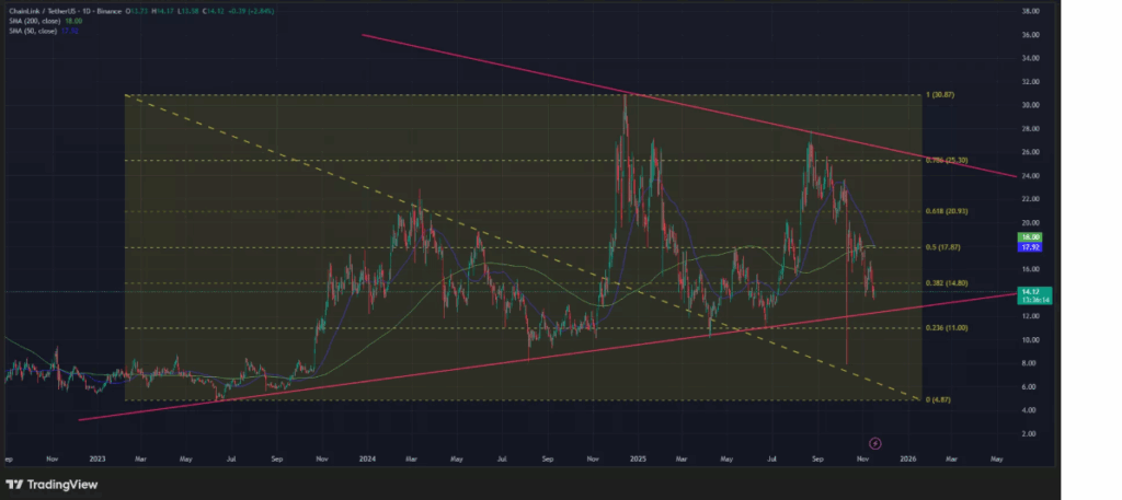 Chainlink’s price has been on a steady decline, down nearly 50% from its yearly high of $27.70 in August. As of November 17, the cryptocurrency is trading at approximately $14.05, showing a marked downturn. The ongoing decline is largely attributed to broader macroeconomic challenges, including concerns over U.S. tariffs on key economies and diminishing expectations of another rate cut by the Federal Reserve in December.