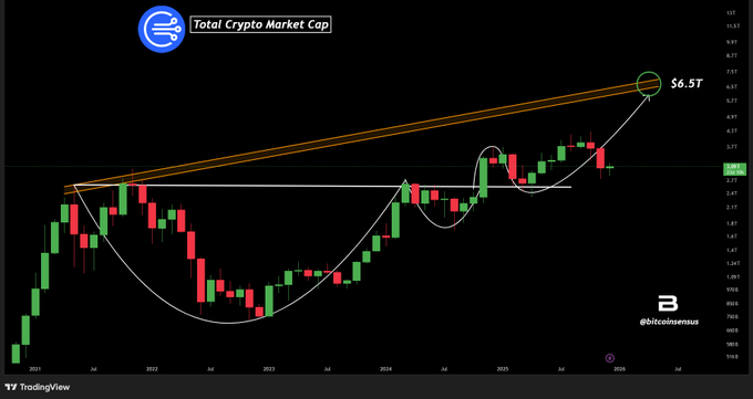 A second rounded base developed across 2024 and 2025, forming a smaller cup-and-handle pattern. This created layered structure rather than abrupt trend acceleration, suggesting controlled consolidation phases. Bitcoinsensus notes the rising trendlines that define the technical ceiling, placing the next major valuation zone at approximately $6.5 trillion.