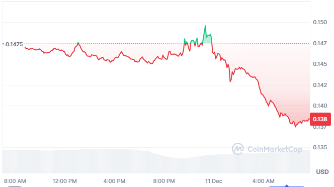 Market sentiment leans cautious as the market cap posts a 6% decrease. The broader structure now moves closer to ranges watched across multi-day charts. The earlier attempted bounce failed to reverse momentum, leaving little sign of an immediate turn. Traders continue watching for any movement back toward the $0.142–$0.145 area.