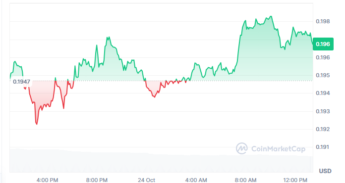 Market action today is a show of Dogecoin traders’ optimistic caution. As yet, short-term volatility is in check, though general sentiment is conducive to possible uptrend movement. Intraday low at $0.1947 was immediately defended, demonstrating that buyers continue to be present around crucial support levels. Price consolidation in the $0.196-$0.198 range suggests ranging ahead of possible directional breakout.