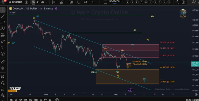 A shared update from More Crypto Online notes that DOGE must reclaim the upper channel boundary to keep the current bullish structure active. The analysis mentions a yellow scenario, which remains valid as long as the micro support does not break decisively. This structure focuses on the early stages of a possible wave progression that relies on holding recent lows.