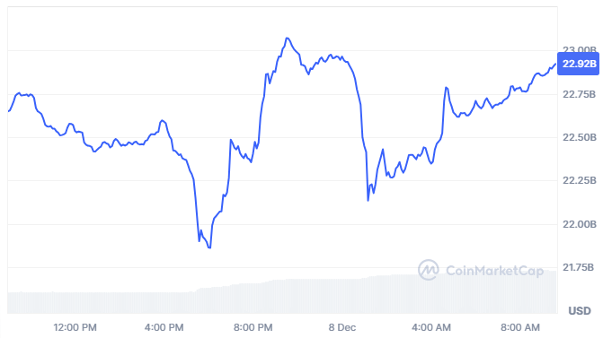 A second decline followed before another upward shift restored the market cap near $22.9B. The gradual rise that followed showed calmer movement compared to earlier fluctuations. This shift reflects reduced stress in the order flow.