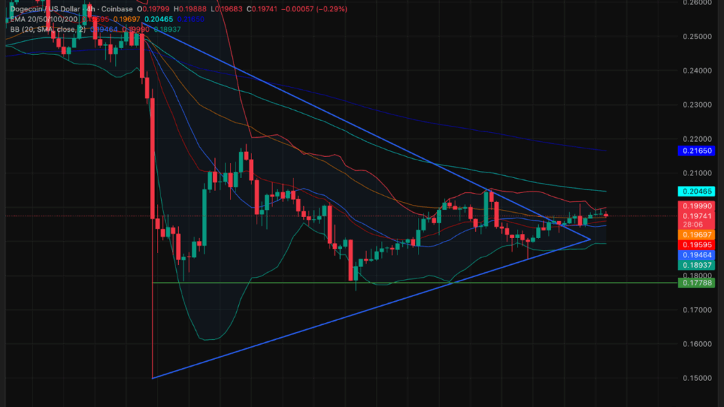 Dogecoin has maintained a steady price of approximately $0.197, hovering within a narrowing symmetrical wedge pattern that has reduced market volatility over the past two weeks. Despite price fluctuations, the cryptocurrency has managed to stay above immediate support at $0.189. However, resistance around the $0.204–$0.205 range continues to cap upward momentum.