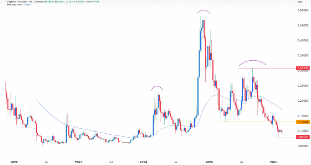 The weekly chart outlines a clear bearish structure. Dogecoin has dropped below the 0.10 dollar support level and continues to trade under its 50 week and 100 week exponential moving averages. These signals confirm sustained selling pressure.