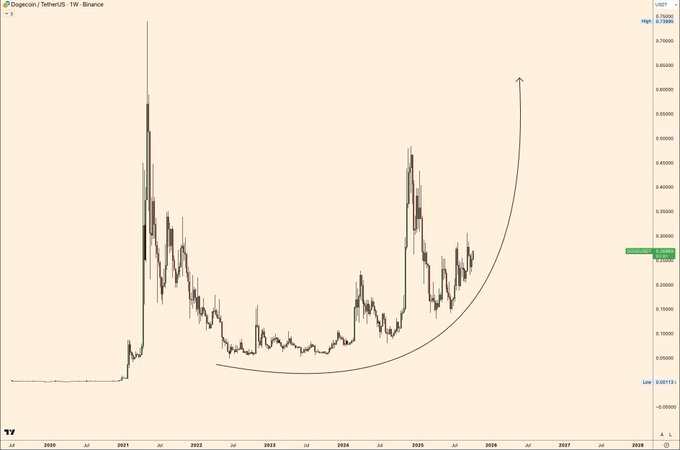 The Dogecoin (DOGE/USDT) weekly chart shared by analyst TheoTrader (@theo_crypto99) presents a clear long-term accumulation structure. The pattern reveals a large rounding bottom — a technical formation often associated with steady accumulation before potential expansion. This setup has drawn attention from several market participants who view it as one of the most constructive base formations in the current cycle.