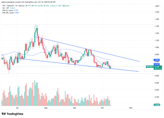 According to Alpha Crypto Signal, WIF’s daily chart forms a well-defined falling wedge pattern — a structure often preceding upward reversals. The token has been tracing lower highs and lower lows within converging descending trendlines. This compressing formation suggests that bearish momentum is weakening as selling pressure fades.