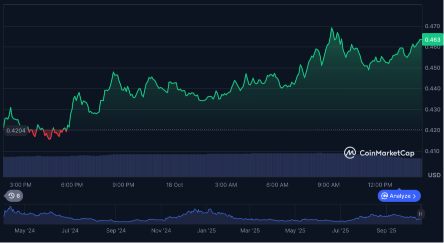 Ethena’s native token ENA has emerged as the top performer in a largely stagnant cryptocurrency market. The asset’s price climbed from $0.41 to $0.47 in just a few hours, marking an impressive 9 percent surge while the broader crypto benchmark gained only 1.77 percent. This rapid growth has pushed Ethena’s market capitalization to $3.35 billion, positioning it as the 32nd largest cryptocurrency by market value.