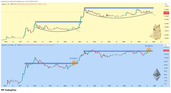 Cantonese Cat’s comparative framework suggests Ethereum’s uptrend often triggers a delayed liquidity migration into meme coins. In the previous cycle, DOGE’s surge followed ETH’s breakout by roughly two to three months, aligning with broader market optimism and retail re-entry.