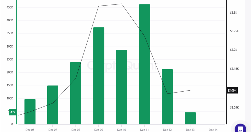 By December 13, price stabilized near $3,090 while participation dropped, signaling indecision and reassessment.
