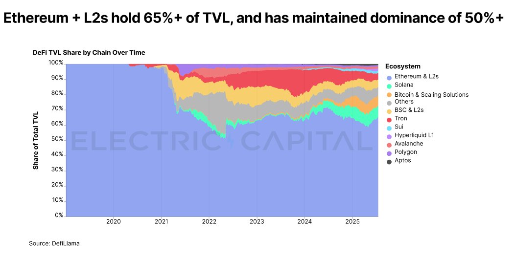 By maintaining more than 50% of DeFi TVL despite increased competition, Ethereum has proven itself as the most relied-on foundation for financial protocols.
