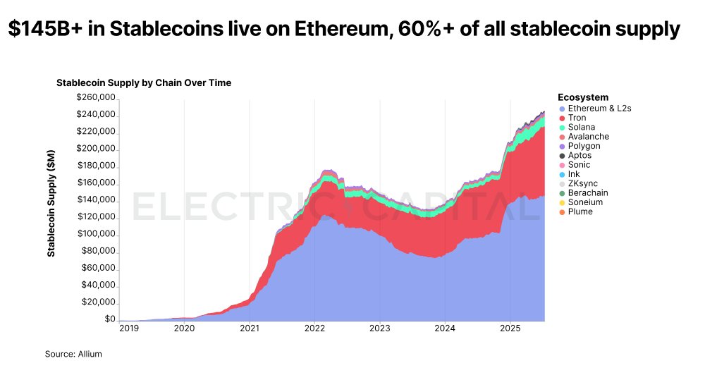 This data shows that Ethereum is trusted to hold the most value in the crypto market. It also leads in stablecoins, with over $147 billion issued on its network. Li shared, “$147B+ in stablecoins live on Ethereum, consistently 60%+ of all stablecoin supply across chains.”