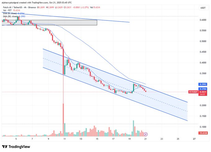 According to Alpha Crypto Signal’s analysis shared on X, FET continues to trade within its descending structure, meeting consistent resistance near the EMA-9 and the 50-period SMA. The value of the price between $0.27 and $0.30 is also a key rejection zone as it acts as a limit stopping the prices to climb upwards. Bearish pressure will prevail until price maintains above the upper limit of the channel at around $0.33.