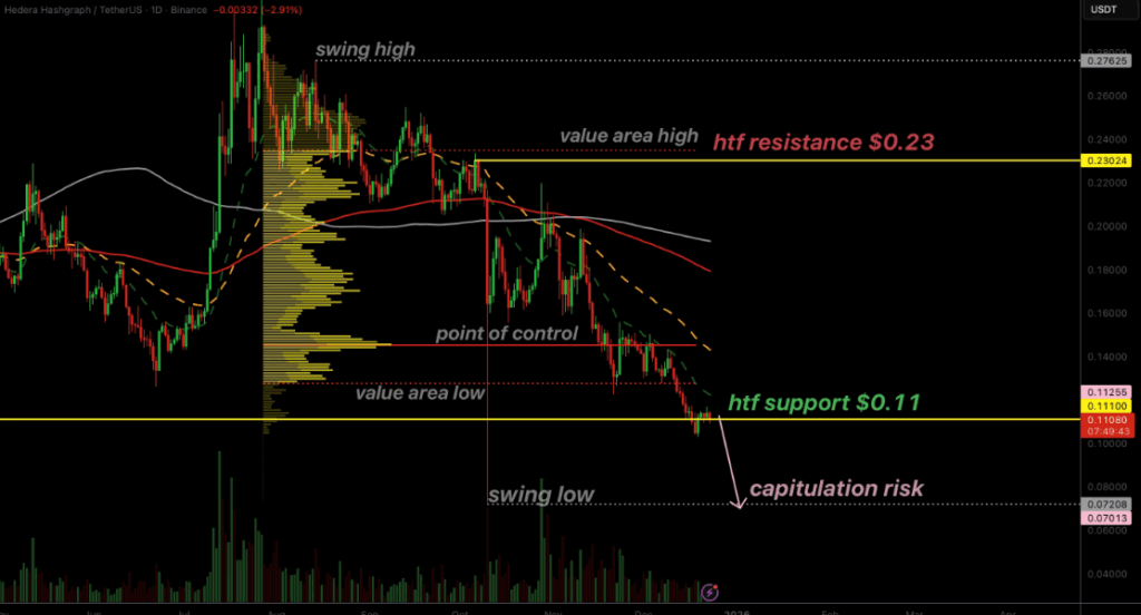 Hedera’s native token HBAR continues to face sustained selling pressure, with price action testing the critical $0.11 support zone. The market remains firmly tilted in favor of sellers, as bearish momentum and a failure to reclaim key resistance levels weigh heavily on the price.