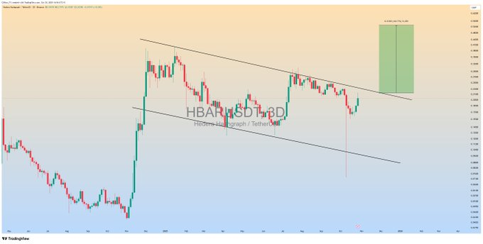 In the current setup, HBAR’s price has been moving within two parallel descending lines that define the flag structure. The price action shows consistent narrowing of range, with higher lows forming inside the pattern — a sign that buyers are gradually absorbing available supply. A breakout above the upper boundary of the flag could confirm renewed momentum, suggesting that the next upward phase is developing.