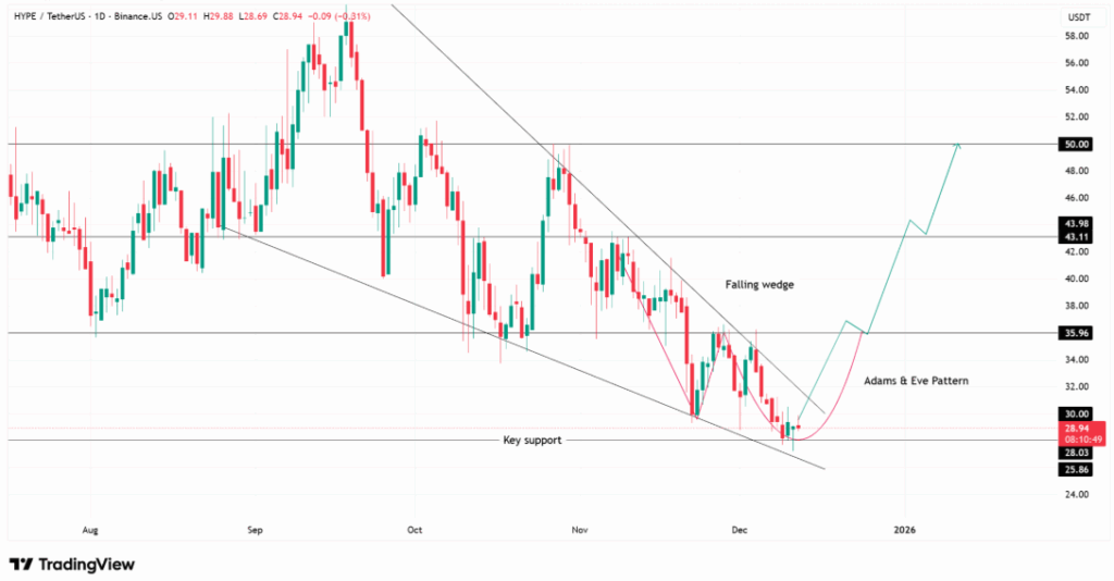 The chart reflects a well-defined falling wedge that developed after extended selling pressure. HYPE formed higher lows along wedge support, showing improving control by buyers. Moreover, the pattern resembles the right side of an Adam and Eve structure, which often supports gradual trend shifts.