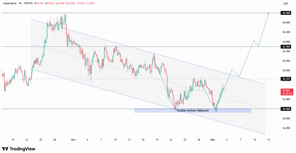 - The established double bottom pattern at the $30 level signals a strong upward move for HYPE, targeting $42.96.
