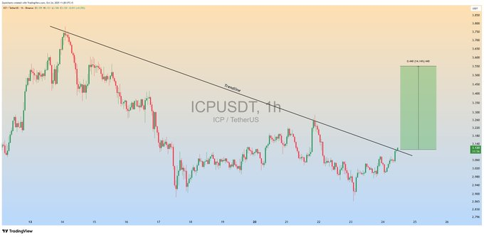 A recent chart shared by ZAYK Charts (@ZAYKCharts) on the 1-hour timeframe shows Internet Computer (ICP/USDT) breaking out of a descending trendline, suggesting a possible short-term reversal. This move comes after a sustained phase of lower highs, where bearish pressure controlled the market.