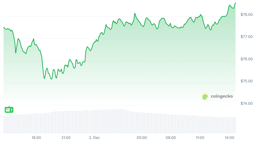 A clean V-shaped rebound appears on the chart as price lifts from mid-$75 levels. This area continues to attract short-term traders who step in when price compresses toward local support. Movement from $76 to $78 shows controlled buying without aggressive expansion.