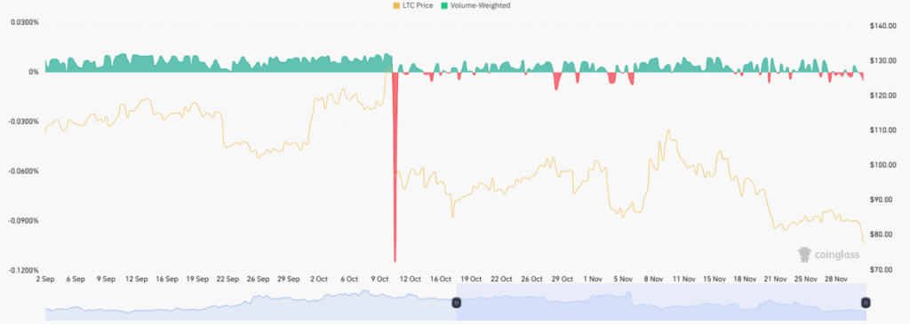 The multi-month chart displays funding rates hovering around neutral through much of the period. Early September saw more positive readings as the price traded above $100, showing stronger long positioning. Later readings show mixed sentiment as red segments increase across October and November.
