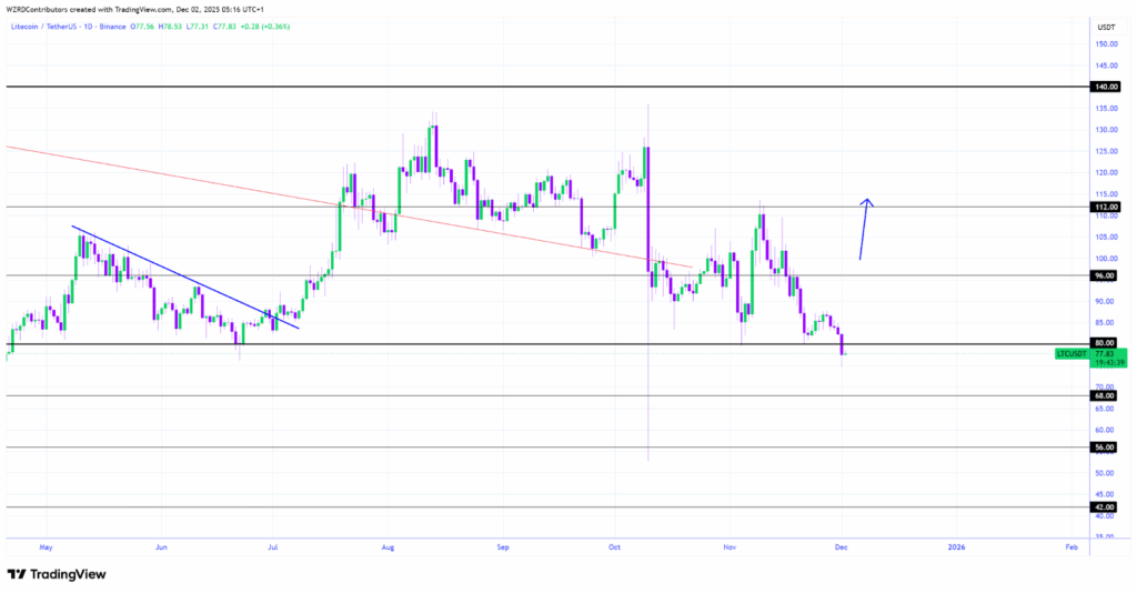 The chart structure shows a series of lower highs and lower lows forming since late October. This controlled descent reflects steady selling pressure as each rebound meets resistance around mid-range levels. Litecoin now sits near the mid-70s zone, a region that has acted as historical demand during past retracements.