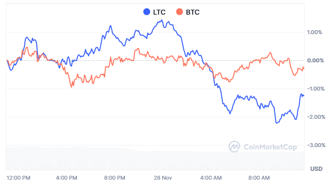 Over the last 24 hours, LTC displayed wider swings compared with BTC. The LTC line on the chart shows early gains that faded quickly due to weak volume. BTC’s steadier performance kept it near the baseline while LTC drifted progressively lower.