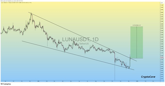 - LUNA breaks a long falling wedge structure, aligning with rising market interest and increased trading activity this week.