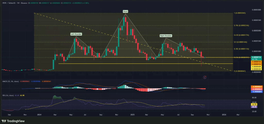 Technical indicators now point to growing bearish momentum. Pepe’s weekly chart shows a clear head and shoulders formation, a classic sign of a potential trend reversal. The neckline sits near $0.0000070, with the head reaching up to $0.000028. A confirmed break below the neckline could intensify losses, possibly driving prices toward the $0.0000040 level.